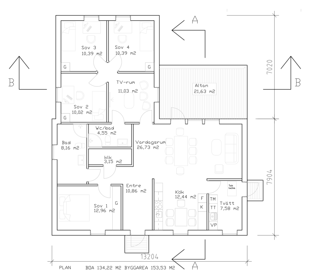 Löväng är ett enplanshus med en boarea på 132,5 m2.